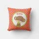 Um travesseiro com um macaco-bebê fofo com um pacificador no seu círculo Dentro e verde-oliva. A palavra Hello acima de sua cabeça, que pode ser personalizada com um nome ou outro texto. O fundo é um padrão de bolinhas laranja e branca.