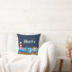 Este travesseiro fofo e divertido pode ser personalizado com um nome. Apresenta um macaco-marinheiro náutico num pavimento de madeira com uma gaivota e um caranguejo. Ao fundo há um farol vermelho e branco, um pássaro giro em um veleiro, ondas oceânicas e um céu azul marinho estrelado à noite.