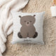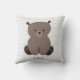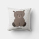 Um travesseiro com um design com o tema da floresta, com a ilustração de um filhote de urso sobre um fundo de cinza. Personalize o nome. O urso está vestindo uma coroa de flores.
