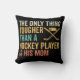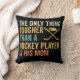 O travesseiro decorativo do tema do hóquei para a mãe com pinto de hóquei e pentes com texto de branco, ouro, aqua e melão que lê A única coisa mais forte que um jogador de hóquei é a sua mãe!