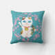 Travesseiro decorativo teal com manekineko japonês, gato calico sortudo cercado por flores de cereja. O medalhão ao redor do pescoço do gato diz "daikichi" o que significa muito boa sorte. O peixe que o gato está segurando também é um símbolo de boa sorte. E o gato calico é o maneko mais sortudo de todos. Este é um travesseiro de sorte!