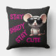 Sassy. Snuggly. Muito fofo. Este travesseiro decorativo ousado apresenta um mouse balançando óculos escuros pretos, em conjunto com o vibrante slogan rosa "Keep Shady Keep Cute" em um fundo preto elegante.