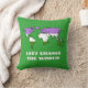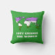 Travesseiro decorativo personalizável com o mapa do mundo na cor do sinalizador do orgulho do gênero, um design em um fundo verde; o texto 'Vamos Mudar o Mundo' é um texto modelo e pode ser alterado.