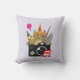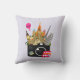 Um travesseiro com uma ilustração gráfica com marcos europeus, como torre inclinada de Pisa, Big Ben, Torre Eiffel, etc. Um balão de ar quente no céu e um ônibus de dois andares, com uma grande câmera. Um selo com as pirâmides egípcias presas à câmera.