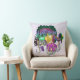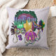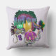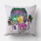 travesseiro decorativo de 20" x 20" com imagens festivas de Mardi Gras de uma morada de penas, máscaras de penas, chapéu de fuchsia sequestrado, miçangas, balões roxos, verdes e dourados e dois corações ametistas roxos. Coordenando o verde. Veja toda a coleção de Travesseiros Mardi Gras no DECOR | Seção Travesseiros.
