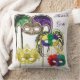 travesseiro decorativo de 20" x 20" com uma imagem de quatro máscaras coloridas Mardi Gras adornadas com penas brilhantes, sequelas e brilho em branco. Texto opcional. Roxo para trás. Veja toda a coleção de Travesseiros Mardi Gras no DECOR | Seção Travesseiros.