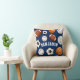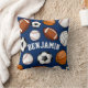 Um travesseiro decorativo do marinho que caracteriza uma variedade de bolas dos esportes e um ponto para o nome do seu receptor do presente centrou-se dentro deles.