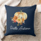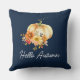 Feliz outono outono outono marinho travesseiro decorativo azul com script branco floral