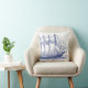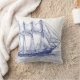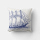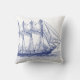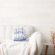 Travesseiro decorativo náutico elegante e elegante, com uma ilustração marinho azul da escuna e um fundo branco.