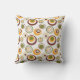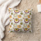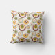 Este travesseiro decorativo tem um design moderno século médio de círculos concêntricos em verde, laranja e castanho sobre um fundo branco.
