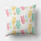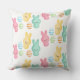 Este travesseiro decorativo na moda apresenta um tema clássico de doces de Páscoa sobre um fundo branco. As doces de marshmallow de coelho da Páscoa, bonitas e coloridas, são enroladas através do travesseiro, com ovos decorados.