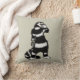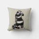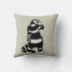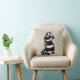 Travesseiro de gato assustador com desenho de tinta representando um estranho gatinho listrado preto e branco com pescoço longo segurando uma máscara de crânio. Parece que uma de suas luvas está fora e sua mão esquelética mostra de sua manga. Pergunto-me se é muito mais uma criatura assustadora do que finge estar no Halloween.