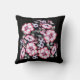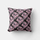 Esse gráfico floral é exibido em um padrão de diamante, com aglomerados de flores, pétalas e folhas, em mudo, de cores de; rosa, fuschia, lavanda, mauve, verde e branco contra um pano de fundo de preto.