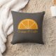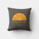 Um travesseiro marrom com meia fatia laranja e texto personalizável embaixo. Pode ser usado para decoração de casa ou como presente para um amante de citros!