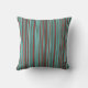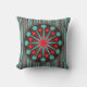 Um design moderno de Meio século legal inspirou uma rajada de estouro contra uma faixa de coordenação em cores vivas de vermelho e turquesa com cinzas sobre fundo marrom decora este travesseiro decorativo.