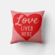 Uma mensagem otimista em um travesseiro que diz "Love Lives Here". Tema das cores vermelha e rosa com um coração grande como motivo principal. Almofada rosa.