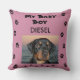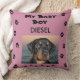 Descubra este belo travesseiro personalizado com a foto e o nome do seu cão. O design permite que você substitua facilmente a imagem e o nome pela imagem do seu próprio animal de estimação. Se seu amigo peludo é uma menina, você também pode alterar o texto em conformidade. O travesseiro apresenta impressões de pata ascendentes de um lado e descendentes do outro, enquanto o dorso é enfeitado com numerosas pegadas contra um pano de fundo azul-escuro e rosa. Peça o seu hoje!