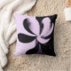A minimalist abstract throw pillow featuring a soft lavender floral form set against a deep black background.