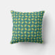 Design de almofada em um padrão de triângulos amarelos com quadrados azuis dispostos aleatoriamente contra uma cor base verde.