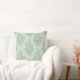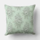 A seamless, repeating botanical pattern throw pillow featuring intricately illustrated floral bouquets in a two-tone mint green palette. The design pairs a soft, textured pale green background with detailed dark green line art, creating an elegant, engraved effect reminiscent of vintage botanical prints. Two distinct bouquet motifs alternate throughout the pattern — one centered around a large, peony-like blossom with elongated leaves, and the other a smaller cluster of delicate buds and blooms. The refined cross-hatched linework adds depth and charm, evoking a timeless, classic toile aesthetic.