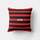 This throw pillow features a minimalistic design with black stripes on red, and monogram in white font. The colors and font are customizable.
