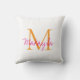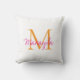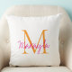 This modern pillow features a monogram and name in stylish pink script and orange typography. It is easily customizable.