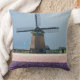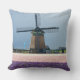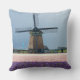 O coxim do travesseiro decorativo da foto com um moinho de vento thatched tradicional atrás de um cheio do campo do jacinto cor-de-rosa e roxo floresce em um dia de primavera perto dos jardins de Keukenhof na região do bulbo em Holland.
