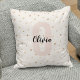 Travesseiro decorativo personalizado com um nome de monograma estético de ouro rosa com pequenos corações ao fundo.