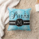 Este travesseiro decorativo chique azul preto e feminino com cor damasco do vintage e personalizado sua inicial do monograma, a palavra "Paris" com a torre Eiffel e uma linha de diamantes brancos impressos em uma banda preta olhará surpreendente em sua quarto ou sala de visitas como um travesseiro do acento. A galeria Gifts© Elke Clarke do monograma projeta o ©