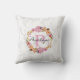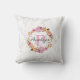 Um travesseiro desenhado com uma coroa floral feita com flores e galhos, galhos e folhas cor-de-rosa e laranja. Esta imagem digital foi originalmente criada com aquarelas e é fofa e tenda. O fundo é uma imagem de mármore branco elegante. Personalize com um nome e uma inicial de monograma.