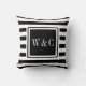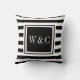 Elegante almofada de decoração com iniciais personalizadas monograma apresentando um padrão listrado preto e branco com suas iniciais. Criado por Thisisnotme©