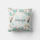 Um travesseiro com um estilo de desenho de linha de padrão de fruta giro. Cor verde-clara e amarela. Um design de verão divertido. Um círculo branco colocado sobre o topo com seu nome e dentro inicial monograma.