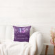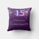 Um travesseiro para uma sala de Quinceañera, com 15 anos de idade. Um fundo roxo profundo com gotas de brilho sujo rosa, manchas. O texto: Quinceañera é escrito em roxo com um grande estilo escrito à mão moderno. Personalize e adicione um nome. O número 15 é escrito com uma fonte no estilo do balão.