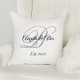 Travesseiro decorativo quadrado elegante do aniversário de casamento com o monograma do casal em uma cinza de rico e roteiro de caligrafia negra. Personalize o tamanho da fonte conforme necessário para os nomes da noiva e do noivo. Personalize as cores preta e cinza, bem como os estilos modernos de fontes de caligrafia. As designs tipográficas são preto, cinza e branco. Você pode adicionar uma cor de fundo.