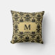 Este travesseiro elegante apresenta uma cor damasco negra bonito sobre uma cor antiga de ouro. Seu monograma em preto é colocado dentro a um círculo pontilhado em uma faixa de ouro correspondente. Bonita, formal e distinta. O verso do travesseiro tem a mesma cor damasco preta bonito sobre o ouro antigo, mas sem faixa e monograma.