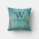 O travesseiro de madeira rústico original, da cerceta e do ouro do olhar perfeito para os antlers primitivos dos cervos do brilho do ouro do falso da decoração da cabine molda uma inicial clássica enorme, preta do monograma do estilo acima do monograma do nome de família na rotulação moderna. Centrado contra um rústico, fundo de madeira do olhar do celeiro do woodgrain no azul da cerceta de turquesa. Idêntico em ambos os lados. Decoração acolhedor, rústica do país com um toque de bling para uma cabine nas madeiras, presente para o caçador dos cervos ou o amante dos animais, ou tema bonito dos animais da floresta para a decoração do berçário da cerceta.