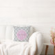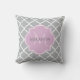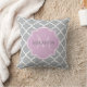 Um travesseiro decorativo quadrado com formato de quatrefoil de cinza cinza, com um crachá escalpado numa lavanda rosada que você pode personalizar adicionando seu nome e monograma inicial. Esta é parte da Cinza da Nave Harbour e da Coleção de Primaveras Rosa-Lavanda.