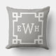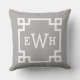 Uma almofada cinza clássica com um monograma personalizável de três letras dentro de uma moldura de borda geométrica branca em estilo Chave Grega. O design limpo branco-no-cinza cria um acento versátil e refinado para qualquer quarto. Personalize com suas iniciais ou o monograma de um casal para um presente atencioso de inauguração ou casamento.