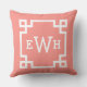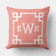 design na moda e travesseiro de sotaque quadrado moderno apresentam um design e um monograma de quadros geométricos de borda grego que podem ser personalizados. Cor de cor laranja/rosa e branca. A cor de fundo pode ser modificada.