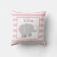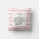 O travesseiro decorativo elefante apresenta um adorável filhote de elefante recém-nascido com salpicos em forma de coração e um fundo com padrão de stripe. Rosas claro modernas, cinzas e esquema de cor branca - perfeito para uma menina. Personalize o texto do monograma da cinza com o nome do seu filho.
