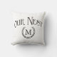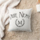 Do "o travesseiro decorativo nosso ninho" tem uma sensação rústica, da casa da quinta do estilo com profundamente - rotulação marrom e caracteriza um teste padrão de madeira do celeiro na parte traseira. Na parte dianteira: Você pode personalizar com suas iniciais no centro da grinalda do louro, e/ou muda a cor do fundo. Na parte traseira: você pode adicionar seu próprio texto feito sob encomenda.