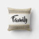 Travesseiro decorativo de família divertida. Fundo bege com padrão preto divertido em cima e em baixo. White está no centro com a palavra Família em uma tipografia divertida e bonito. Diversão e na moda!