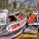 Um design de arte de velhas lanchas amarradas no canal esperando a restauração.