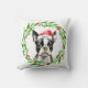Travesseiro decorativo de Natal feriado com uma aquarela de Boston Terrier e design de terra natalícia com cor d'água. Adicione o nome dos cachorros ao design e é a ideia perfeita de presente para aquele amante de cachorros que você conhece, ou você mesmo!