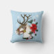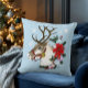 Um retrato de perfil lateral de uma rena com uma coroa de Natal. A coroa de Natal tem verde, arco vermelho, morangos vermelhos e diversos ornamentos de bola num pano de fundo azul claro e flocos de neve.