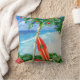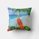 Boas festas dos Sandy Beach mornos de sua praia tropical favorita da ilha. Palmeira decorada com enfeites de natal e luzes, com uma prancha retro que inclina-se contra a árvore de Natal.