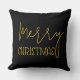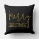 Este travesseiro apresenta um moderno design minimalista com uma elegante letra de tipografia do "Feliz Natal" a preto e dourado com fundo preto e é um presente perfeito para a sua casa ou para outra pessoa durante as férias.