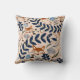 Two views of a decorative pillow with a stylized nature pattern. The design features blue and orange leaves, abstract shapes, and fox motifs on a beige background, creating a playful and cheerful tone