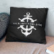 Travesseiro decorativo náutico lendo seu nome de barco personalizado cercado pelo poço de um navio e ancorando a preto.