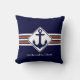 Travesseiro decorativo na moda Marinho Azul NAUTICAL, mostrando um dentro grande de âncora em um quadrado branco no centro. Em segundo plano estão as faixas da cor de BRANCO e TAN, colocadas sobre um fundo AZUL MARINHO escuro. Na parte inferior está o TEXTO PERSONALIZÁVEL que diz ANCHORED IN CRISTO, que você pode PERSONALIZAR adicionando seu nome ou seu nome de barco, etc. O design é o mesmo no sentido inverso, mas o texto é UNLINKED, para que você possa substituir o texto por um nome diferente, conforme desejado.